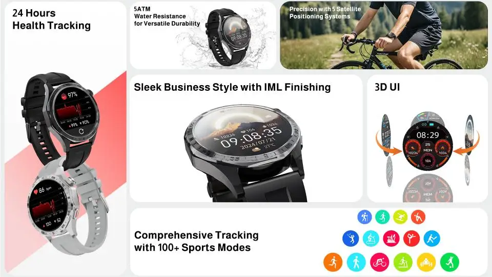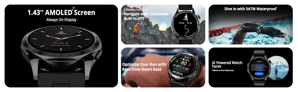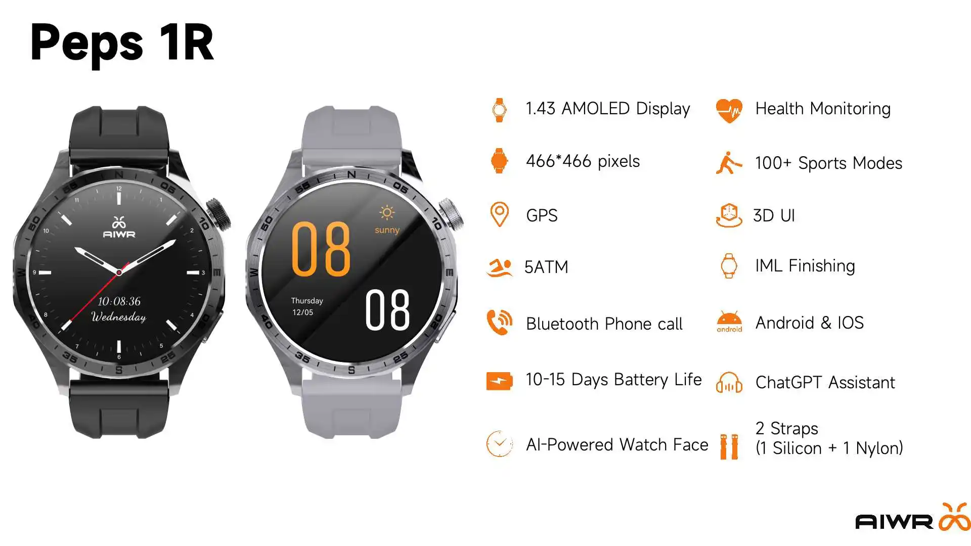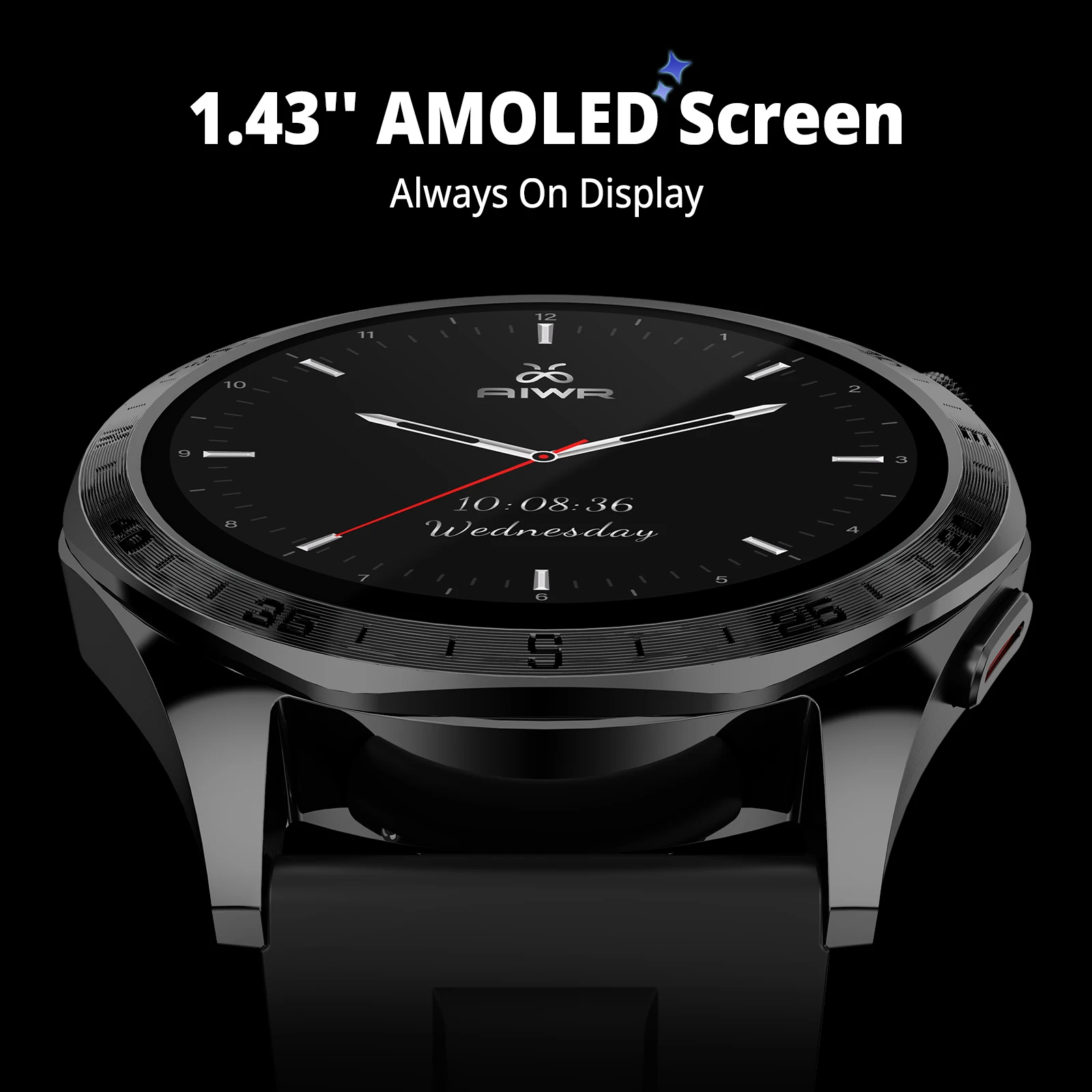 Smartwatch AIWR Peps 1R, Android, GPS, tela AMOLED de 1,43”, mostradores com IA, monitor de frequência cardíaca e sono, resistente à água 5ATM, compatível com Android e iOS.